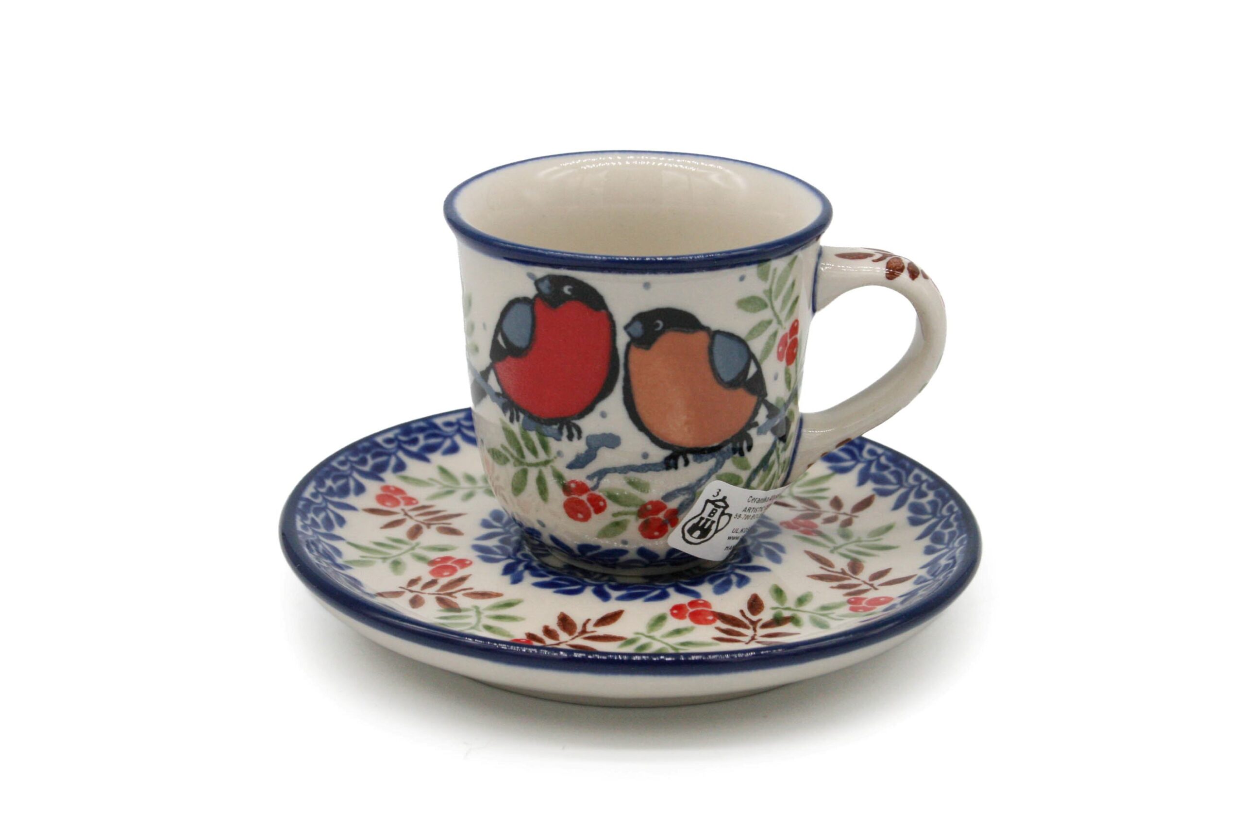 Wyjątkowa, malutka filiżanka wraz ze spodkiem, ozdobiona wzorem z bestsellerowymi gilami. Produkt jest malowany ręcznie. Ceramika bolesławiecka cechuje się trwałością i jest bardzo dobrej jakości. Ceramiczna filiżanka jest idealna na espresso, podwójne espresso oraz małe americano. Może być dobrym prezentem dla bliskiej osoby.