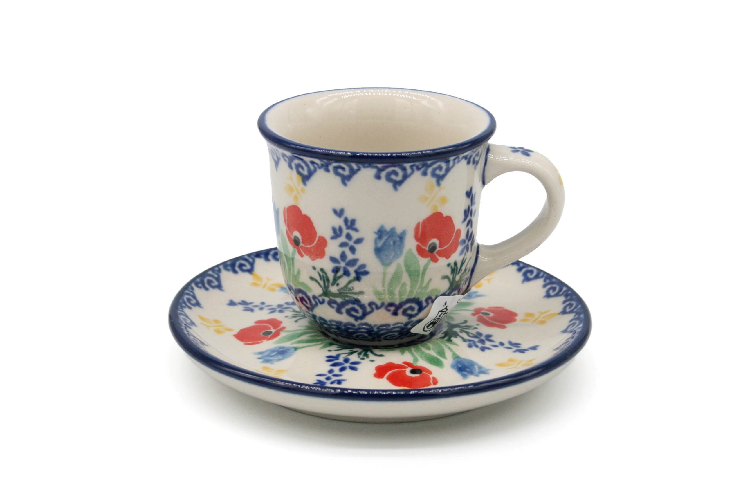 Wyjątkowa, malutka filiżanka wraz ze spodkiem, ozdobiona wzorem z makami i motylkami. Produkt jest malowany ręcznie. Ceramika bolesławiecka cechuje się trwałością i jest bardzo dobrej jakości. Ceramiczna filiżanka jest idealna na espresso, podwójne espresso oraz małe americano. Może być dobrym prezentem dla bliskiej osoby.