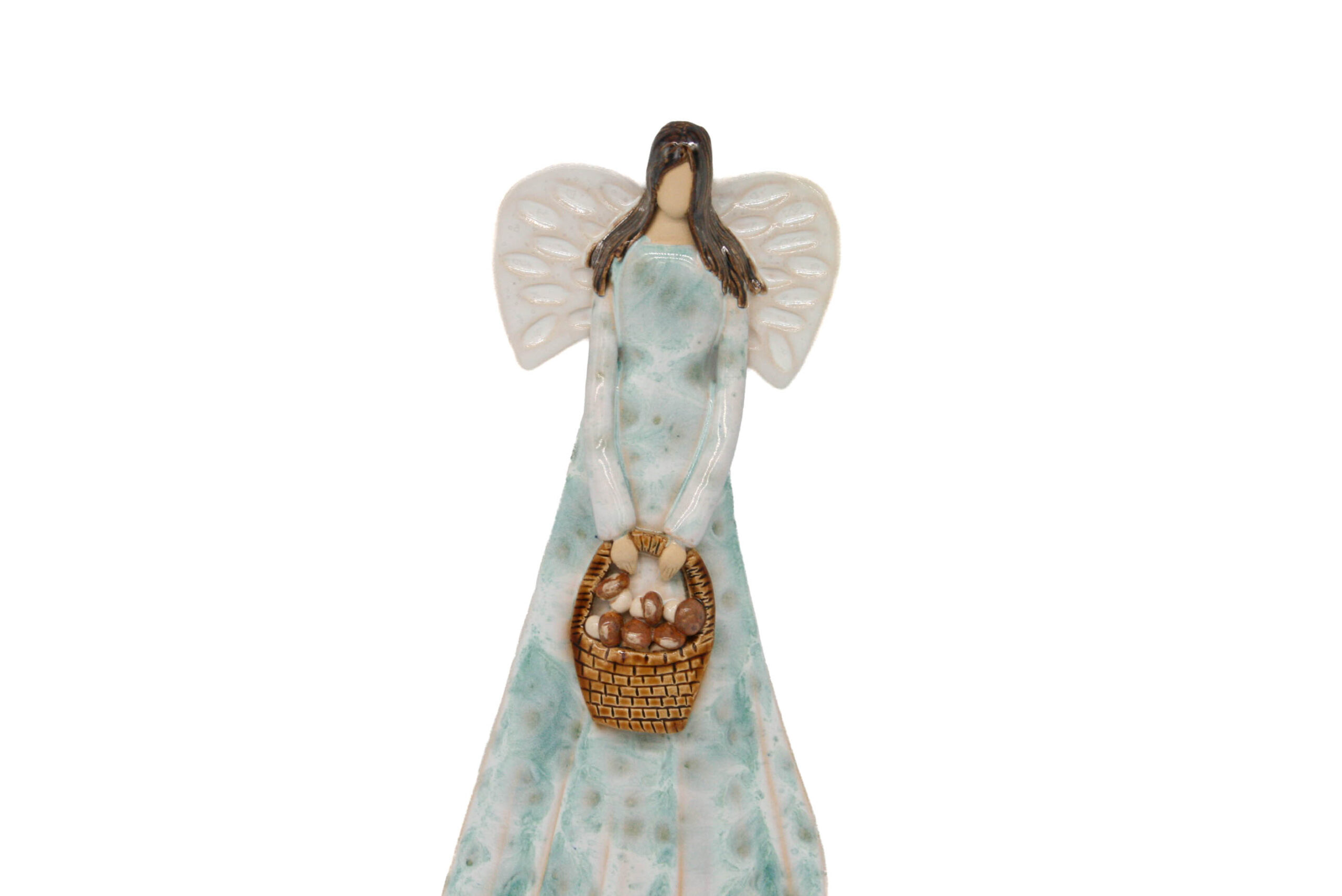 Unikatowy, ceramiczny anioł w przepięknej, jasnej sukni z koszem grzybów. Anioł posiada wgłębienie, które umożliwia powieszenie go na ścianie. Może być dobrym prezentem dla bliskiej osoby.