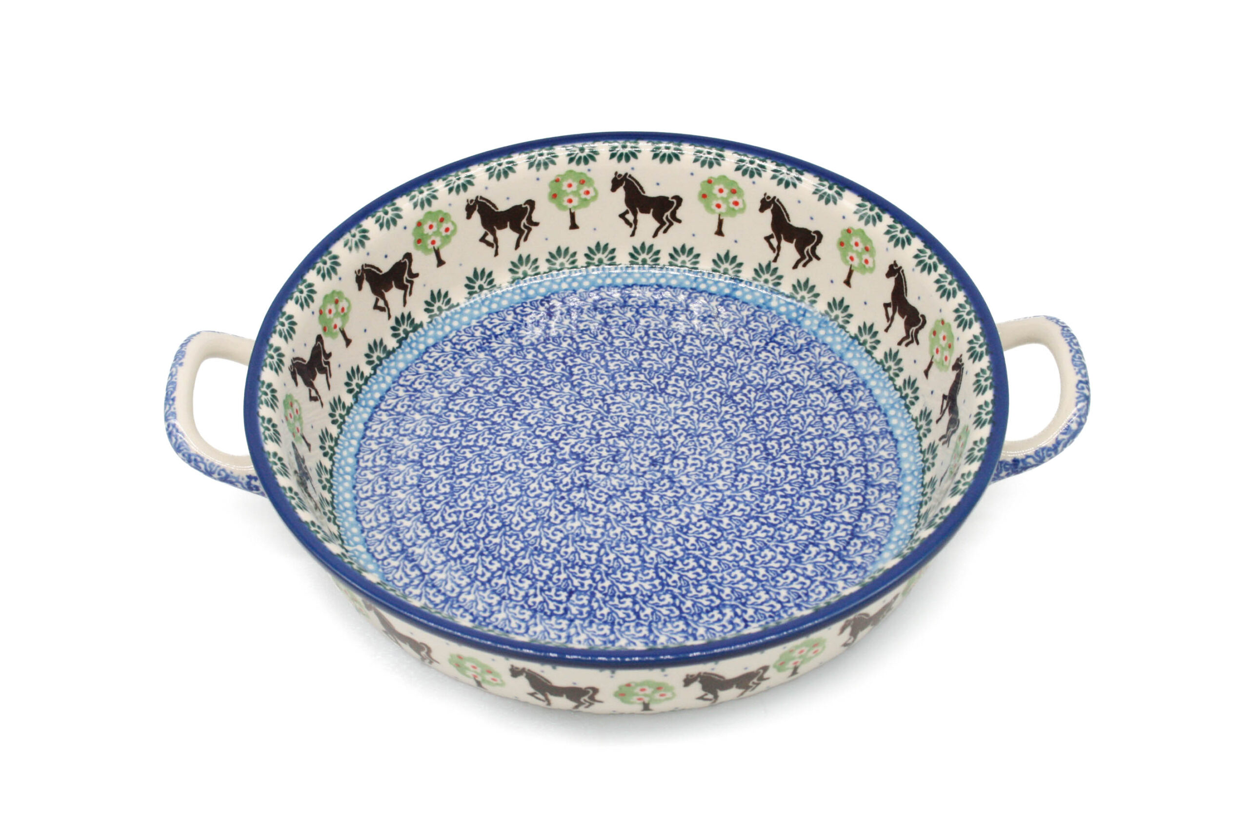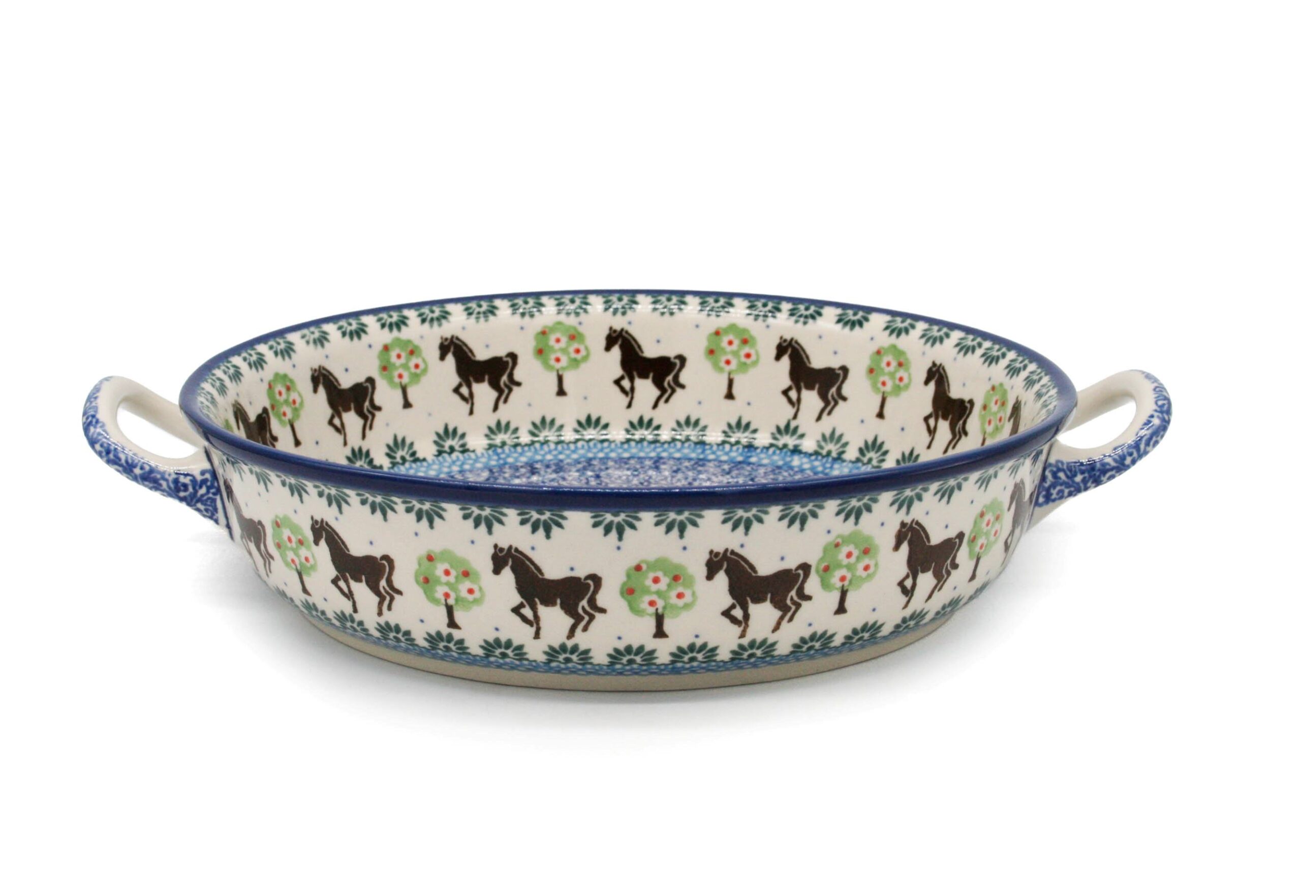 Ceramiczny, mały zapiekacz w pięknym wzorze z konikami. Naczynie jest bardzo zgrabne i poręczne, posiada uchwyty. Zapiekacz został wykonany ręcznie. Podobnie jak inne naczynia ceramiczne z Bolesławca, jest bardzo odporny i trwały. Może posłużyć zarówno do zapiekania gorących potraw, np. ciast, pasztetów, lasagne, jak i jako naczynie do serwowania sałatek czy przechowywania drobiazgów. Można używać go w piekarniku, jest odporny na wysokie temperatury.