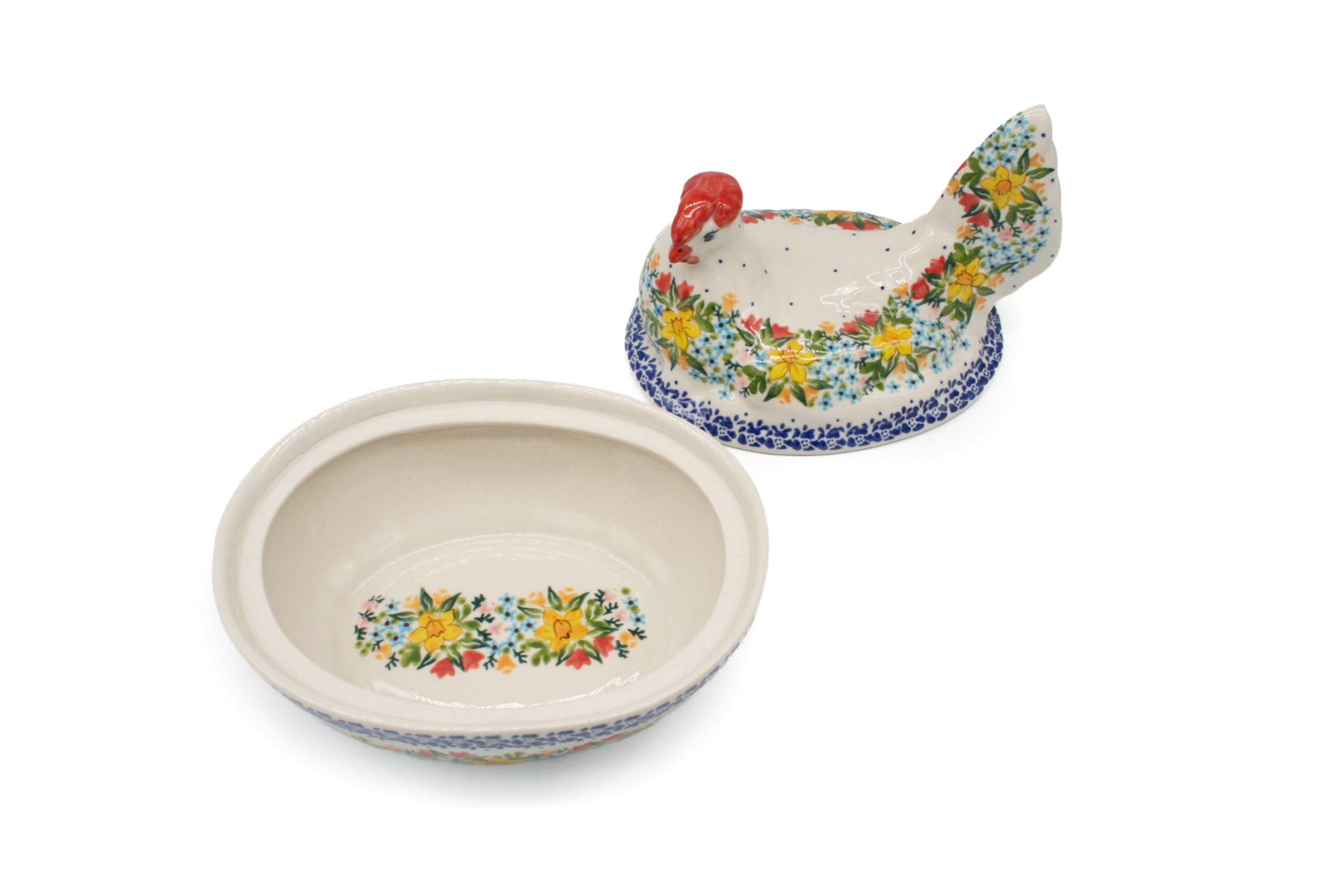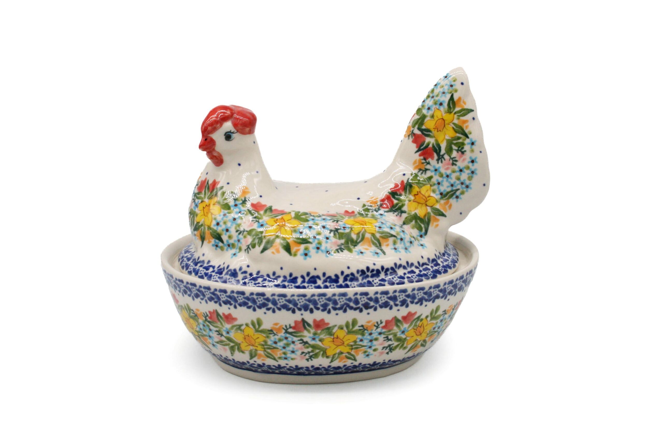 Oryginalna, ręcznie malowana kura w pięknym wzorze z żonkilami. Kura może posłużyć jako naczynie do zapiekania oraz jako reprezentacyjna ozdoba na stół, w której można podać posiłek. To przykład ceramiki bolesławieckiej, która cechuje się trwałością i jest bardzo dobrej jakości. Kura jest ręcznie malowana, a następnie wypalana w piecu zgodnie z tradycją ceramiki bolesławieckiej. Niecodzienny kształt i wzór sprawiają, że produkt może okazać się wyjątkowym prezentem dla bliskiej osoby.