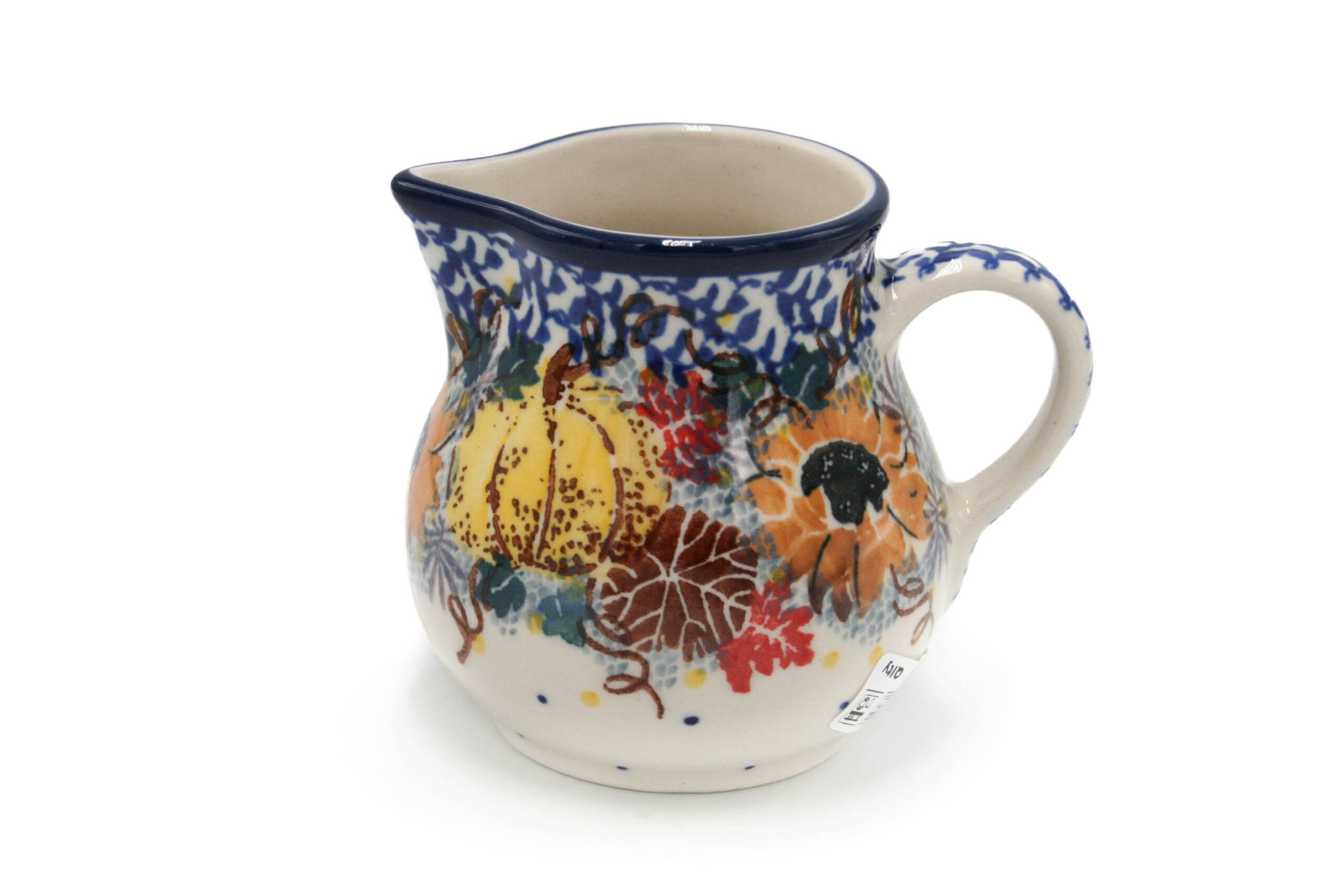 Zgrabny mlecznik w pięknym wzorze w słoneczniki i dynie. Mlecznik jest ręcznie malowany, a następnie wypalany w piecu zgodnie z tradycją ceramiki bolesławieckiej. Ceramika bolesławiecka cechuje się trwałością i jest bardzo dobrej jakości. Ceramiczny mlecznik służy do spieniania i serwowania mleka do kawy, można też używać go jako sosjerkę. Jest dobrym prezentem dla bliskiej osoby.