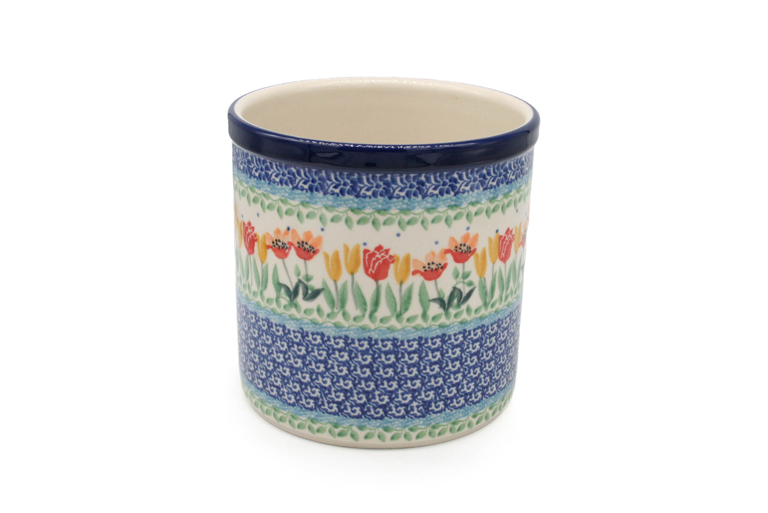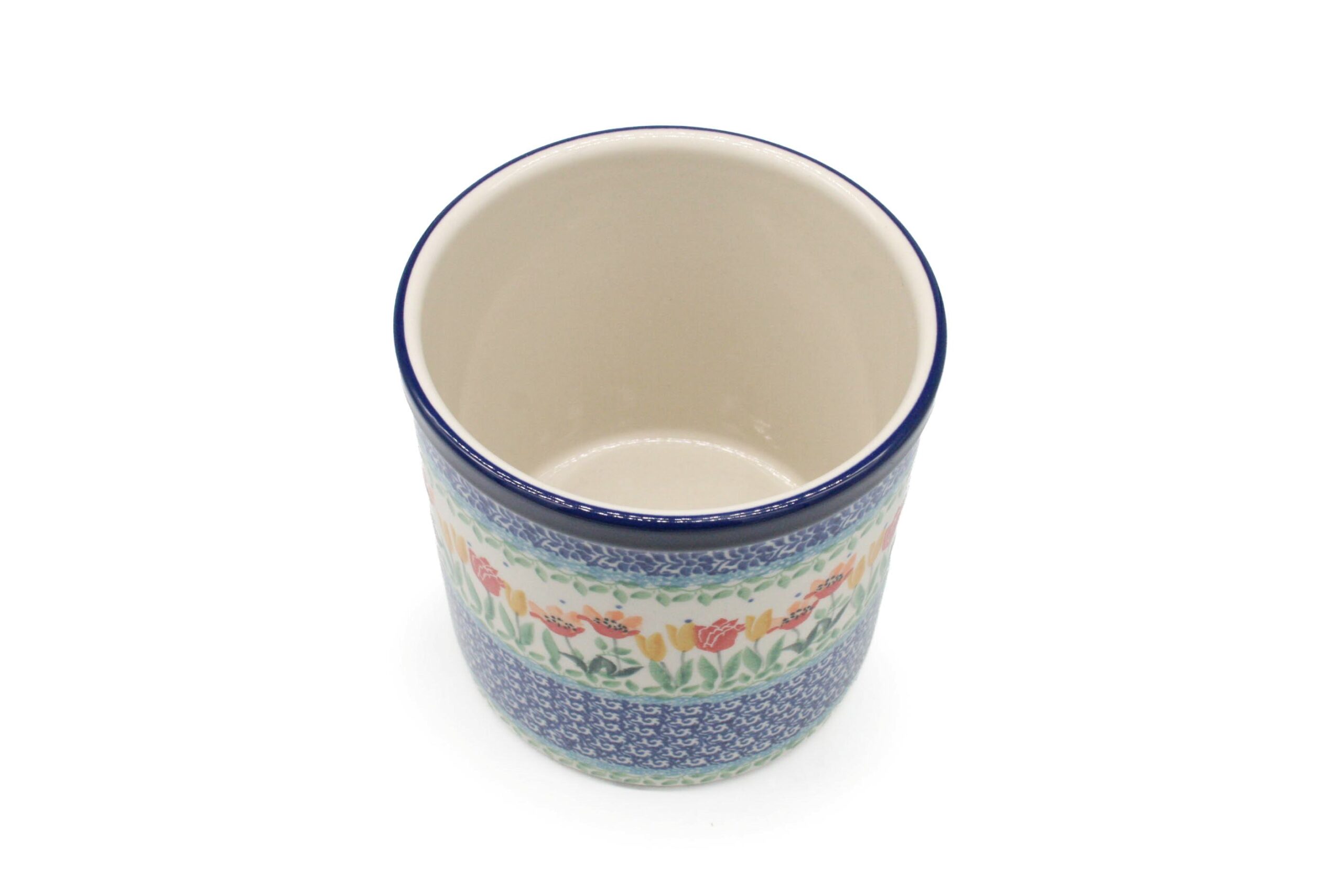 Pojemnik na sztućce ozdobiony kwiatowym wzorem z drobnym motylkiem. Pojemnik jest malowany ręcznie, to przykład ceramiki bolesławieckiej, która cechuje się trwałością i jest bardzo dobrej jakości. Może być dobrym i praktycznym prezentem dla bliskiej osoby.