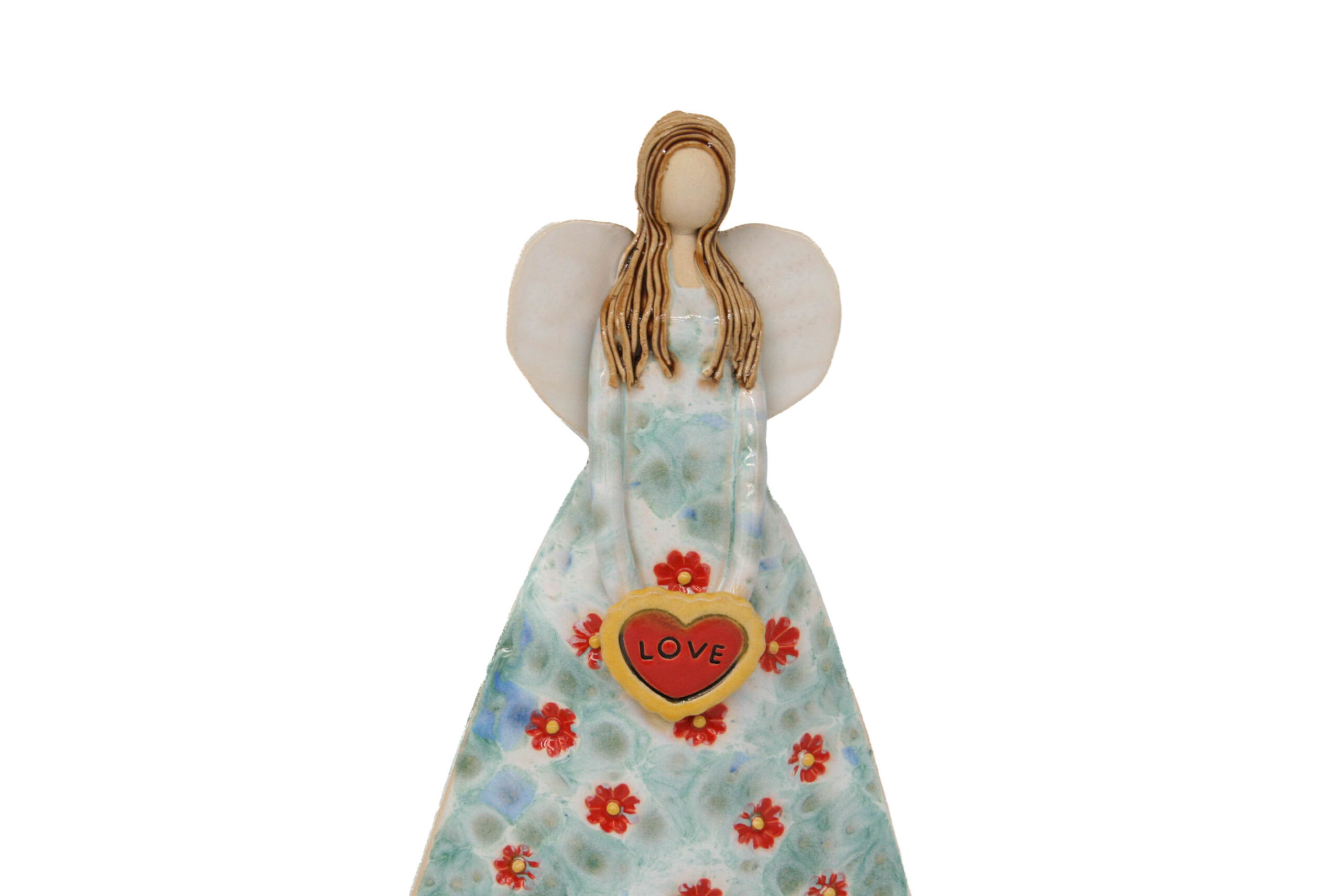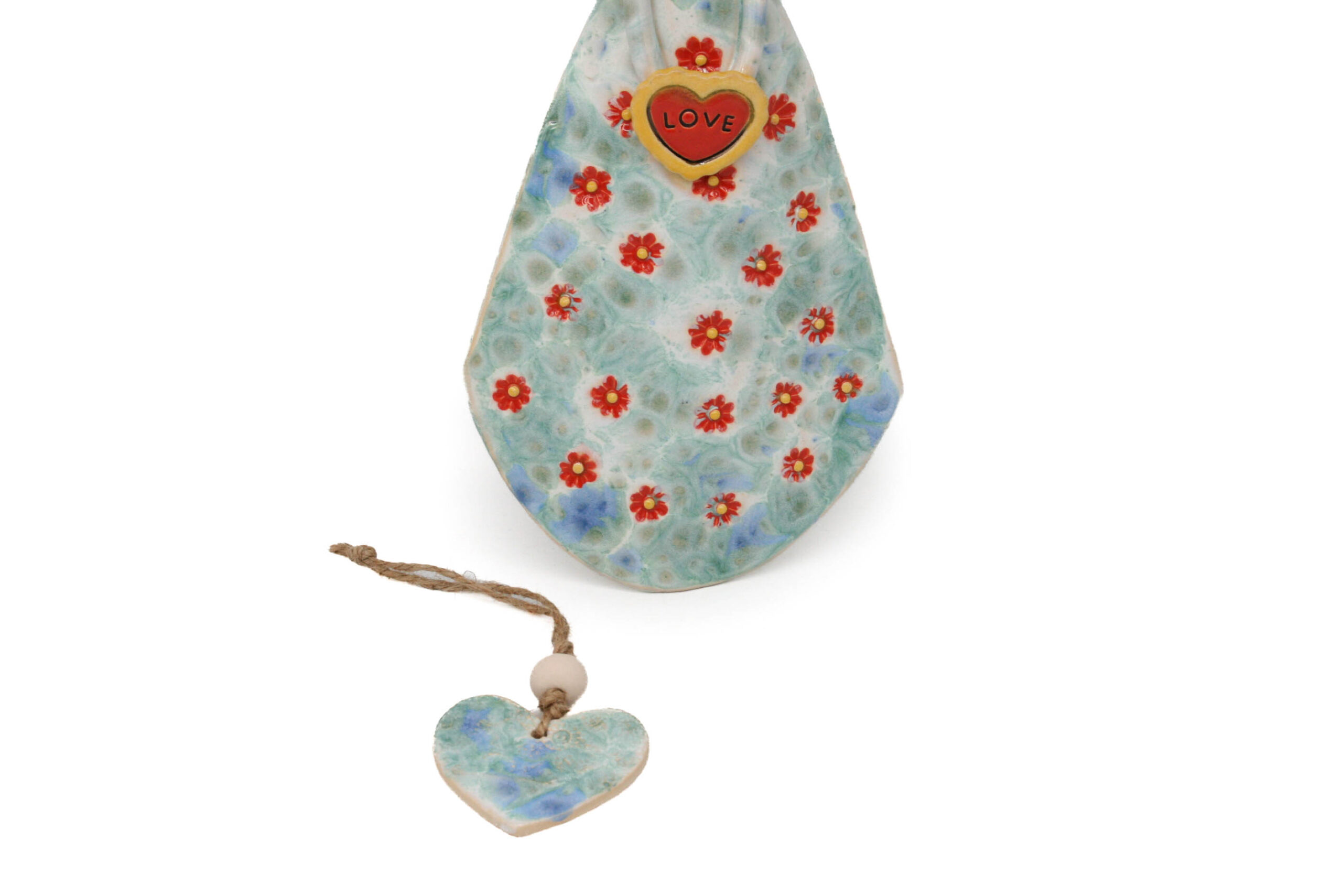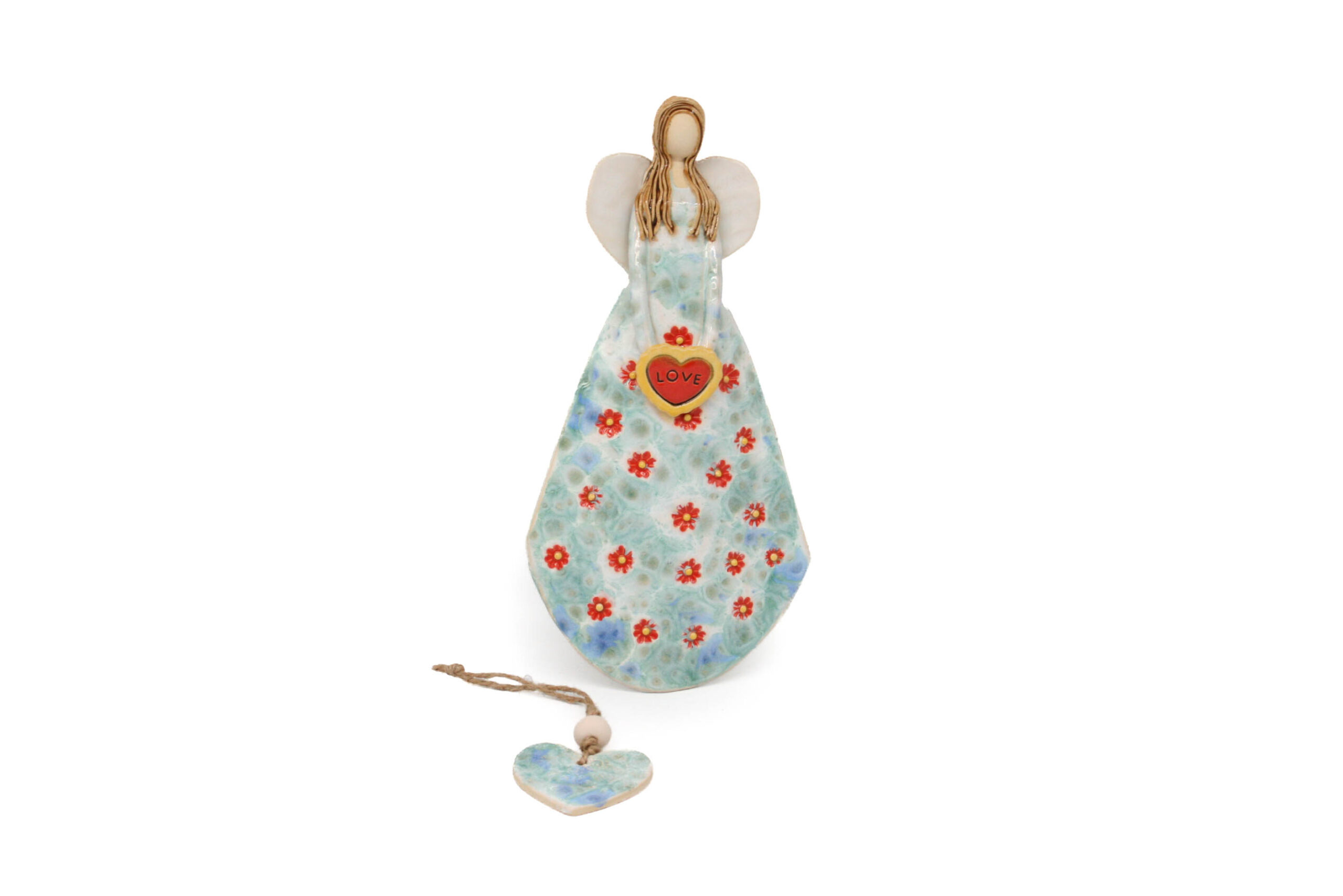 Unikatowy, ceramiczny anioł w kwiecistej sukni z serduszkiem. Anioł posiada wgłębienie, które umożliwia powieszenie go na ścianie. Może być dobrym prezentem dla bliskiej osoby.