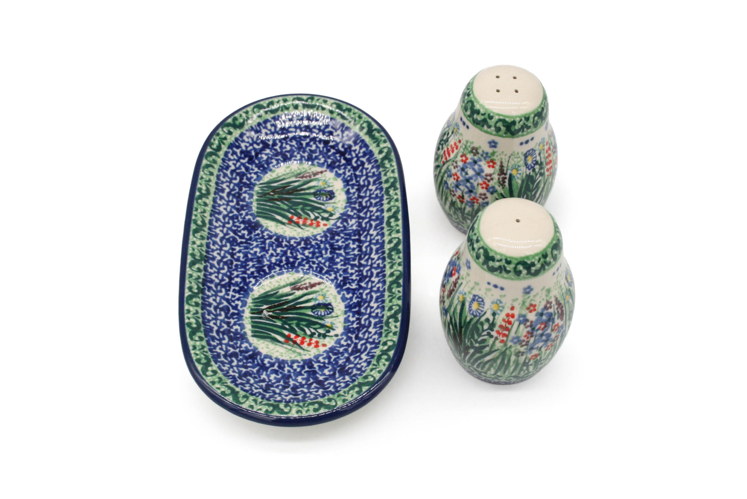 Ceramiczny zestaw do przypraw w pięknym, unikatowym wzorze przypominającym polanę. Komplet zawiera pieprzniczkę i solniczkę. Zestaw jest bardzo zgrabny, poręczny i praktyczny. Wszystkie elementy zostały wykonane ręcznie metodą stempelkową. Podobnie jak inne naczynia ceramiczne z Bolesławca, są bardzo odporne i trwałe. Komplet jest pięknym i praktycznym uzupełnieniem do zastawy.